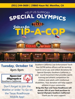 Join Southern California Law Enforcement Torch Run officers as they serve and collect donations for Special Olympics Southern California. Dine in or order to go and help fund year round training and athletic competitions for athletes with intellectual disabilities. Bring this flyer and Texas Roadhouse will donate ten percent of your food purchase to Special Olympics Southern California.