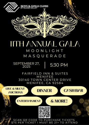 Step into an enchanting evening at the Boys & Girls Clubs of Inland Valley’s 11th Annual Gala: Moonlight Masquerade! The night will dazzle with a delicious dinner catered by Chef Rosie of Lady R Bistro, exciting entertainment, live and silent auctions, and drinks. Arrive masked and ready to support the over 1,500 youth that will benefit from your participation in this fun and magical evening! We invite you to celebrate our Club, mission, and the impact we make in the over 1,500 youth we serve. Sponsorships and tickets available. For more information please contact Julia Burch at 951-24-8845 or juliab@menifeebgc.org.