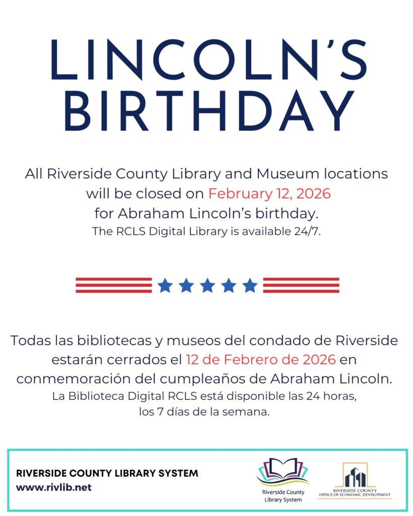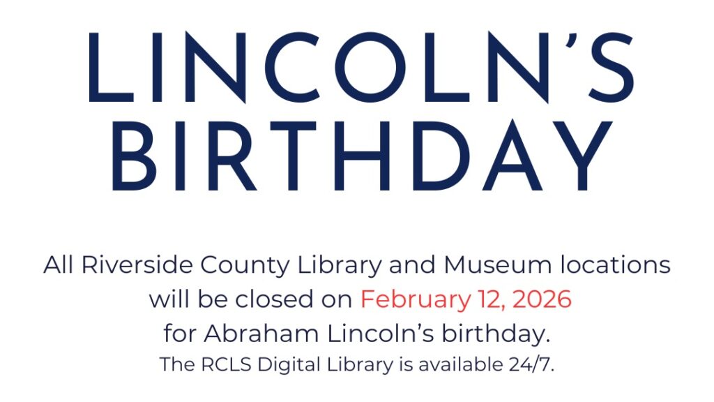 All Riverside Library and Museum locations will be closed on February 12th, for Abraham Lincoln’s birthday.