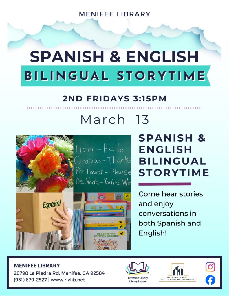 Come join Menifee Library on Friday, March 13th, at 3:15pm for a Special Bilingual Storytime presented in Spanish and English!