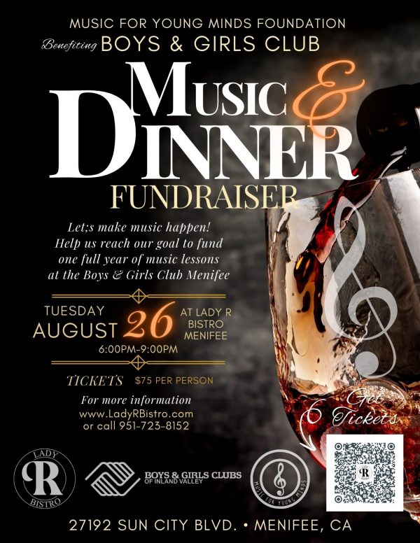 Join us Tuesday, August 26th, 6–9 PM at Lady R Bistro for a special evening benefiting the Boys & Girls Club of Menifee through the Music for Young Minds Foundation. Together, we’re raising funds to provide one full year of free music lessons for local kids.