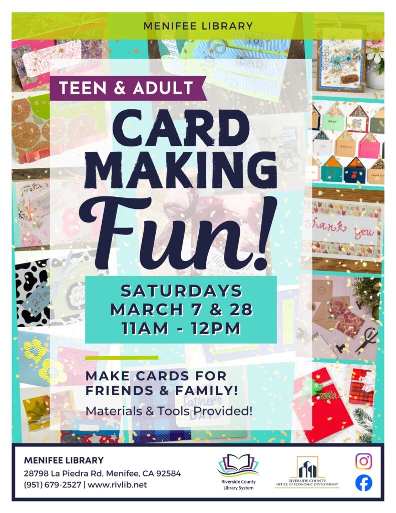 Adults and Teens! Come join Menifee Library on Saturdays from 11:00am – 12:00pm in the Community Room for our Card-Making Fun program! All materials will be provided!
