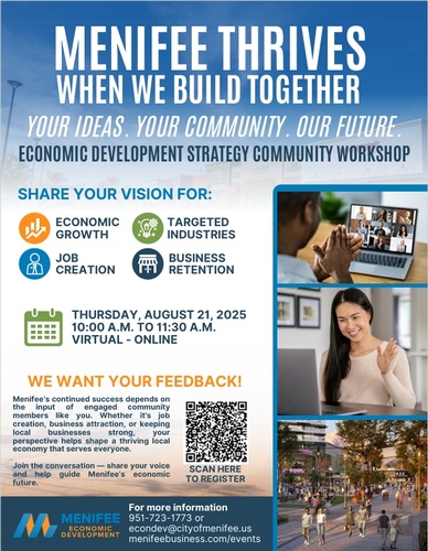 Menifee’s future is built together. This interactive workshop is your chance to share your voice and help shape the city’s economic development strategy. Whether it’s job creation, business attraction, or strengthening local businesses, your perspective matters.