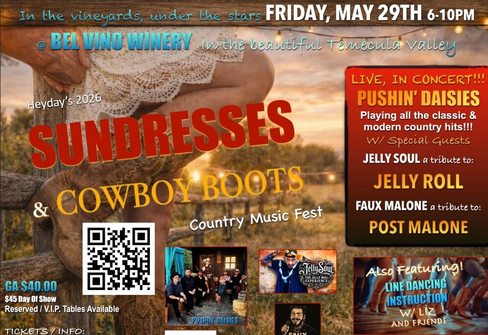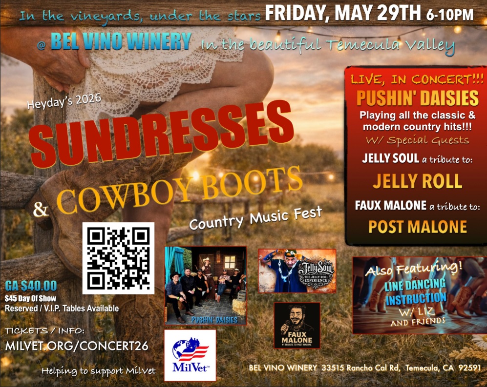 Join MilVet and Heyday at Bel Vino Winery for an unforgettable evening with great music by Pushin’ Daisies, tributes Jelly Soul and Faux Malone, line dancing, raffles and more! A portion of the tickets purchased here to support MilVet’s programs for deployed troops, veterans and their families.