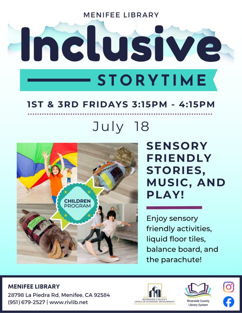 Come join Menifee Library in the Opportunity Room from 3:15pm – 4:15pm on the first and third Fridays of the month for an Inclusive Storytime. Sensory friendly stories, music and play!