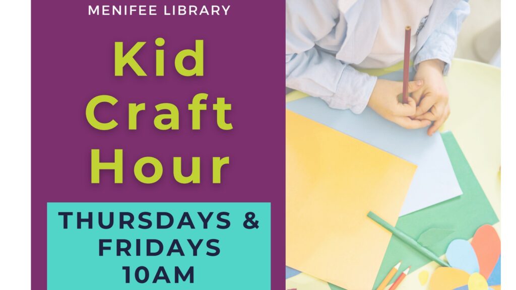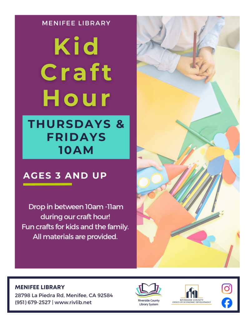 Come join Menifee Library from 10am – 11am in the Community Room for a Kids Craft Hour. Kids three and up are welcome to join us for a drop-in craft time.