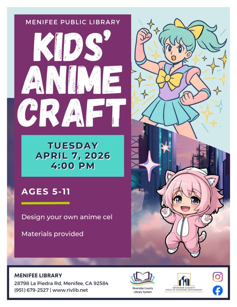 Come join Menifee Library on Tuesday, April 7th, at 4pm in the Community Room to make a fun Anime Craft!