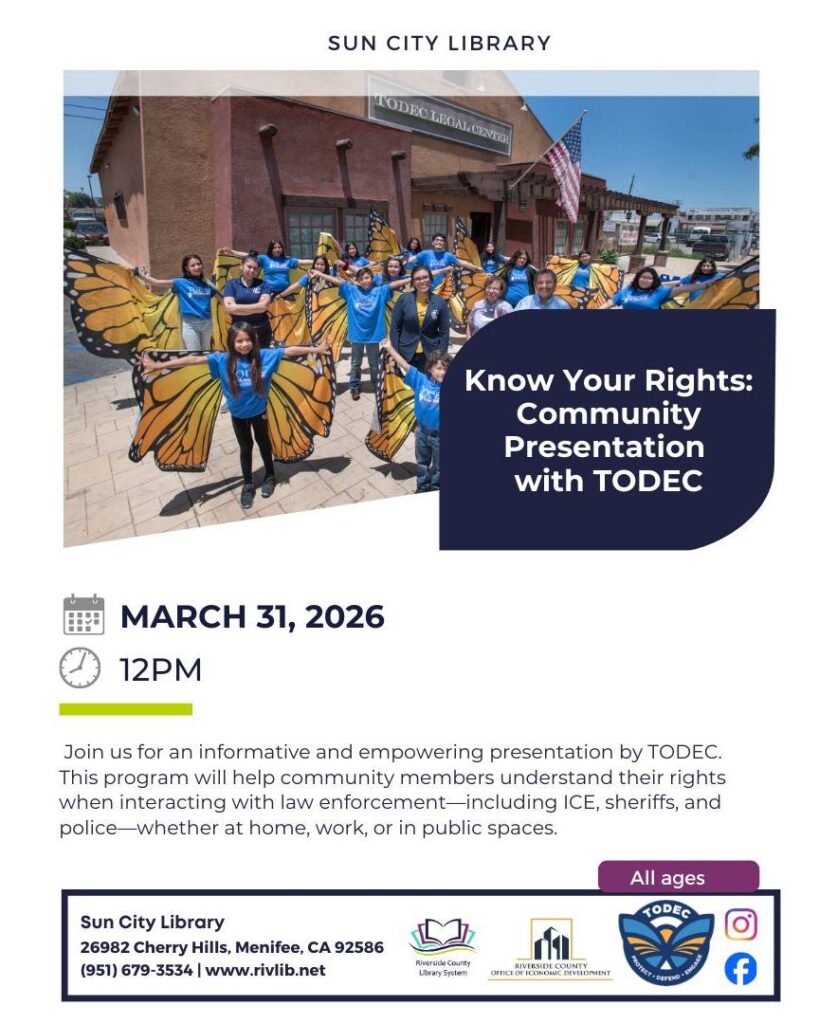 Join us for an informative and empowering presentation by TODEC. This program will help community members understand their rights when interacting with law enforcement – including ICE, sheriffs, and police – whether at home, work, or in public spaces.