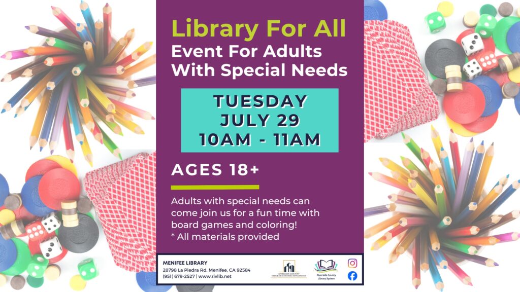 Adults with special needs come join Menifee Library in the Community Room on Tuesday, July 29th, at 10:00am for a fun morning of board games and coloring!