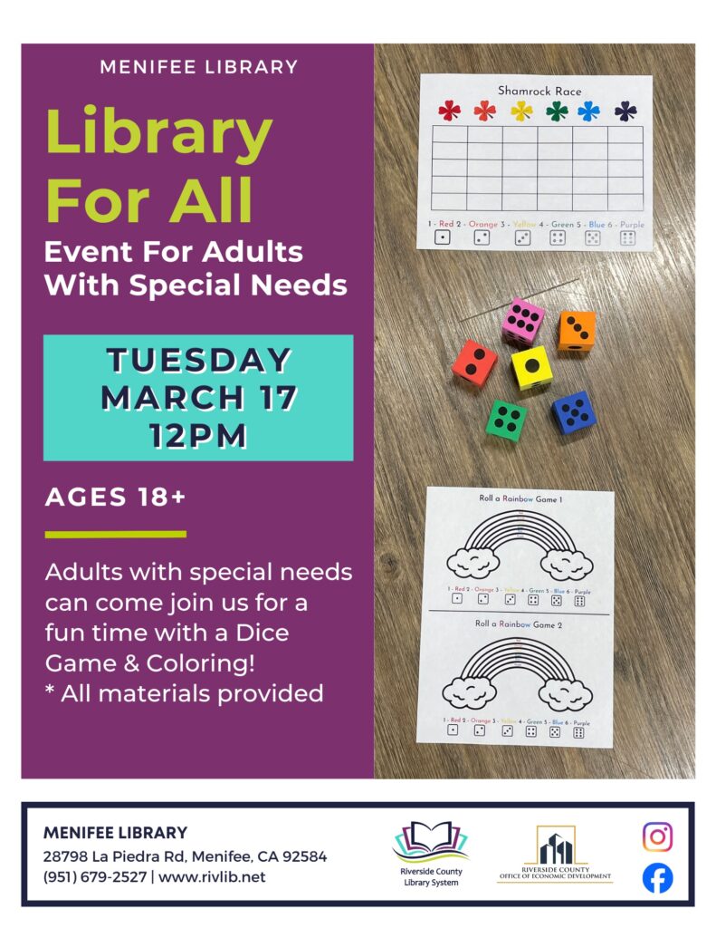 Adults with special needs come join Menifee Library in the Community Room on Tuesday, March 17th, at 12:00pm for a fun afternoon of Dice Games and Coloring!