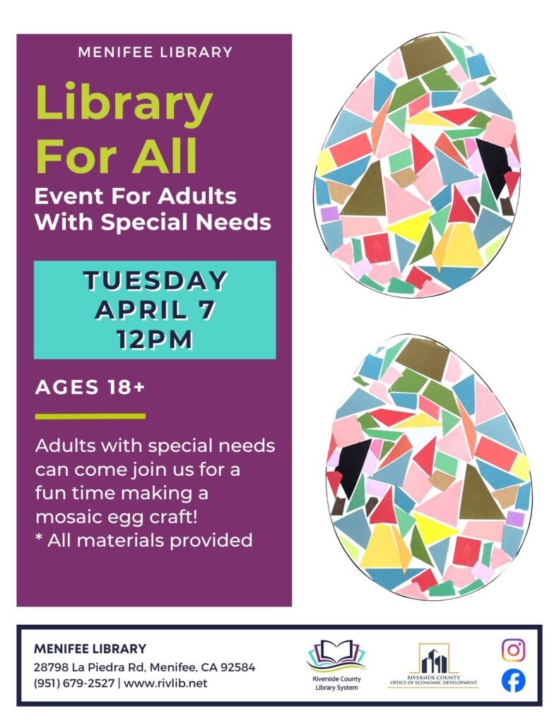 Adults with special needs come join Menifee Library in the Community Room on Tuesday, April 7th, at 12:00pm to make a Mosaic Egg Craft!