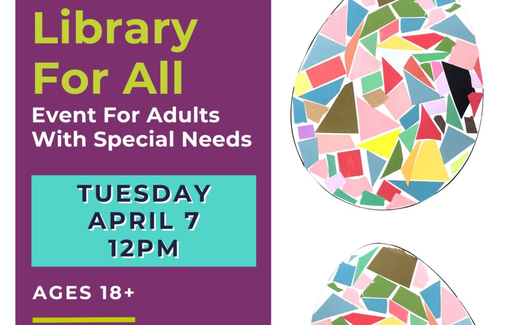 Adults with special needs come join Menifee Library in the Community Room on Tuesday, April 7th, at 12:00pm to make a Mosaic Egg Craft!