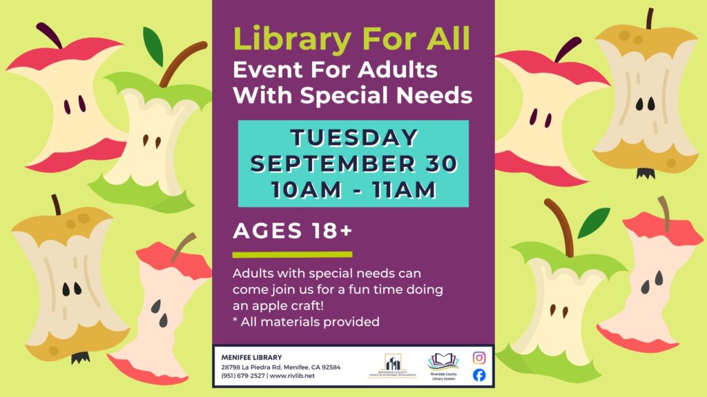 Adults with special needs come join Menifee Library in the Community Room on Tuesday, September 30th, at 1:00pm for a fun paper plate apple core craft!