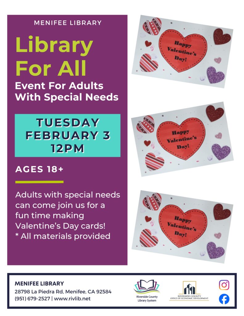 Come join Menifee Library on Mondays from 11am to 1pm for Adult Lettering and Calligraphy. Sign Ups are required. All tools and materials will be provided. No class on 2/16.