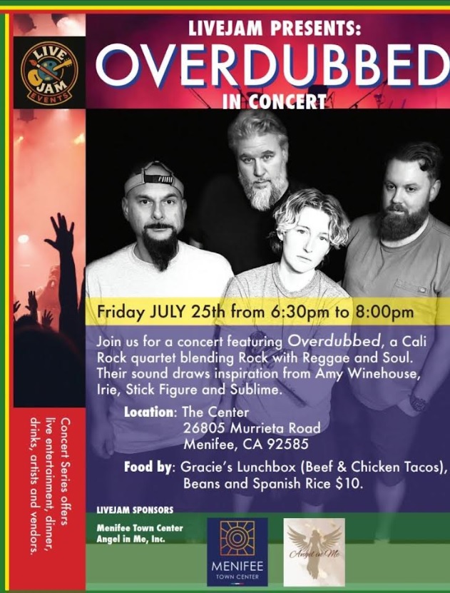 Mark your calendar! This month’s FREE LiveJam VII features the ultra cool soulful rock reggae band, Overdubbed in concert. Tacos, beans and rice by Gracie’s Lunchbox. Artists and Artisans will be selling their items.