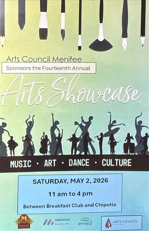 The Arts Council Menifee presents their 14th Annual Menifee Arts Showcase. Artists booths and a variety of entertainment line the sidewalk between Chipotle and Breakfast Club.
