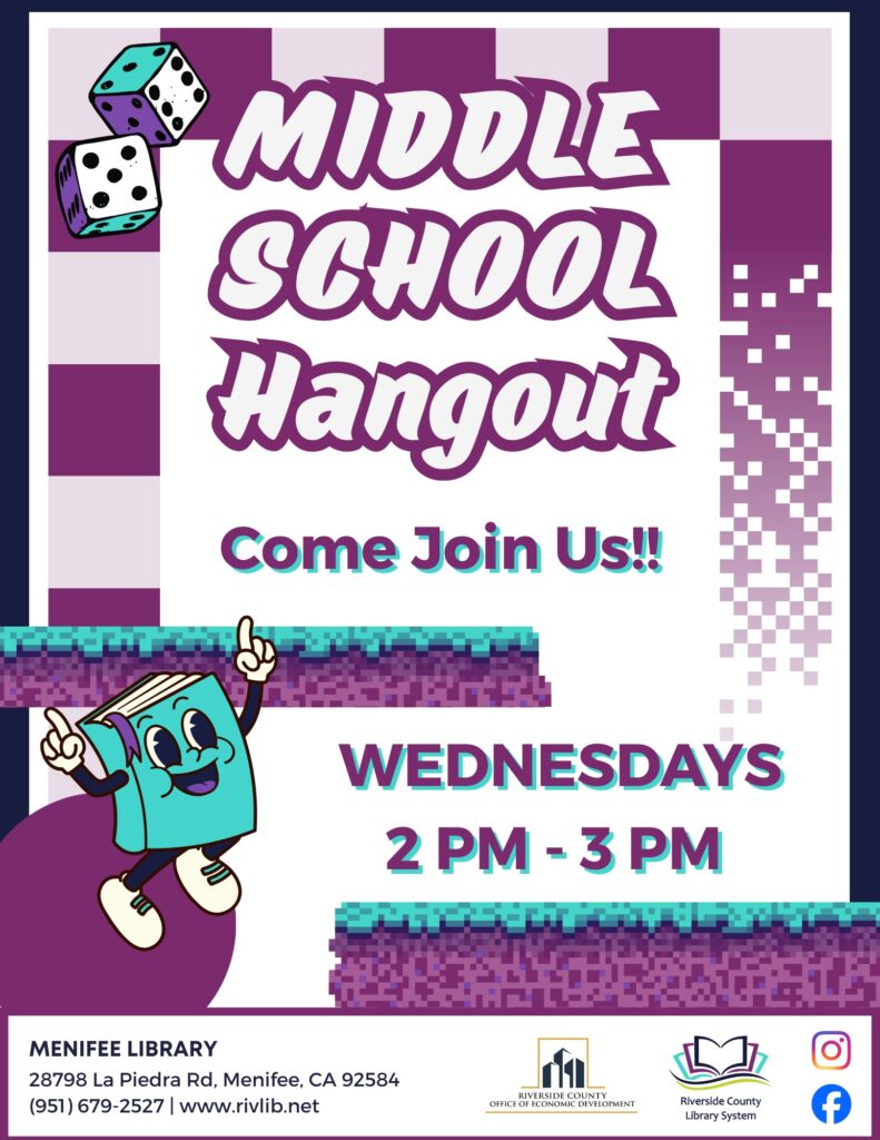 Middle Schoolers! Come join our Middle School Hangout! Wednesdays from 2pm – 3pm in the Opportunity Room.