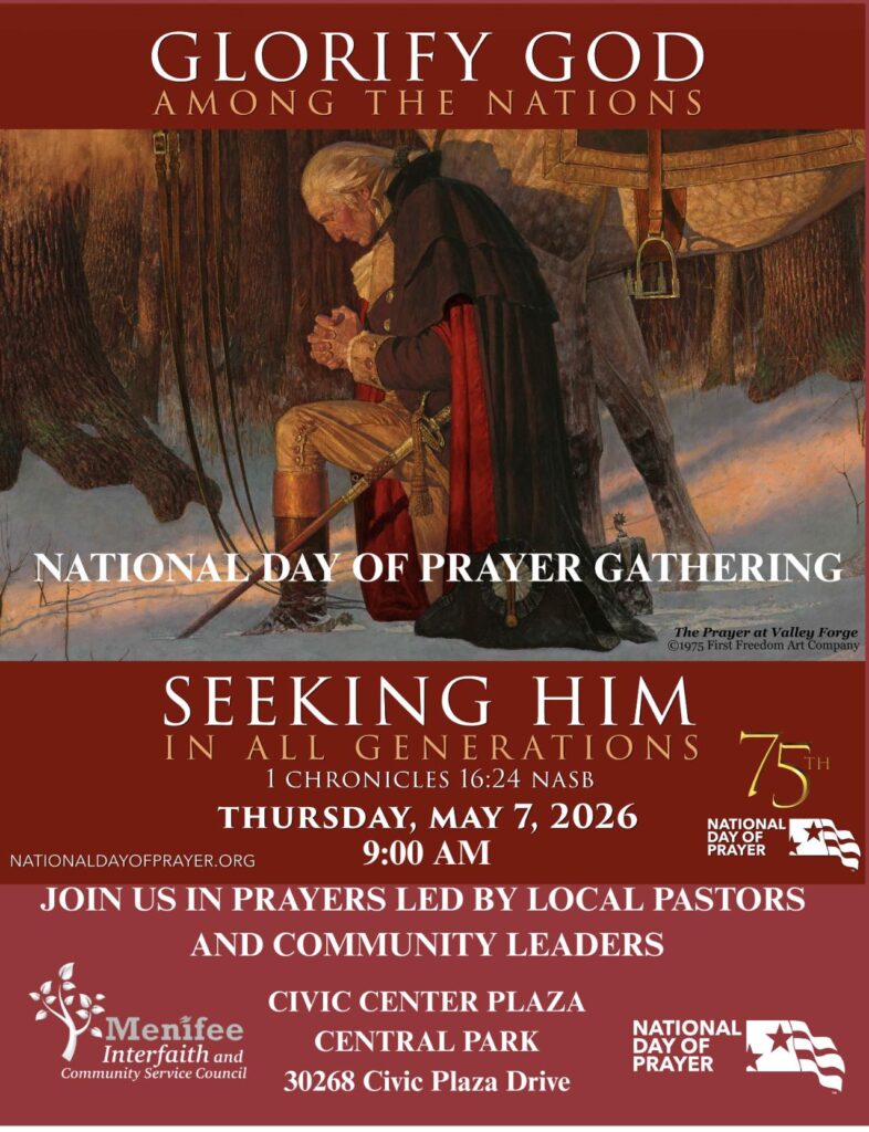 NATIONAL DAY OF PRAYER, Thursday, May 7. The Menifee interfaith community cordially invites you to join us. Please refer to the enclosed flier for details. If attendance is not possible, kindly take a moment at noon on this day to offer a prayer for Government, Military, Media, Business, Education, Church, first responders and Family.