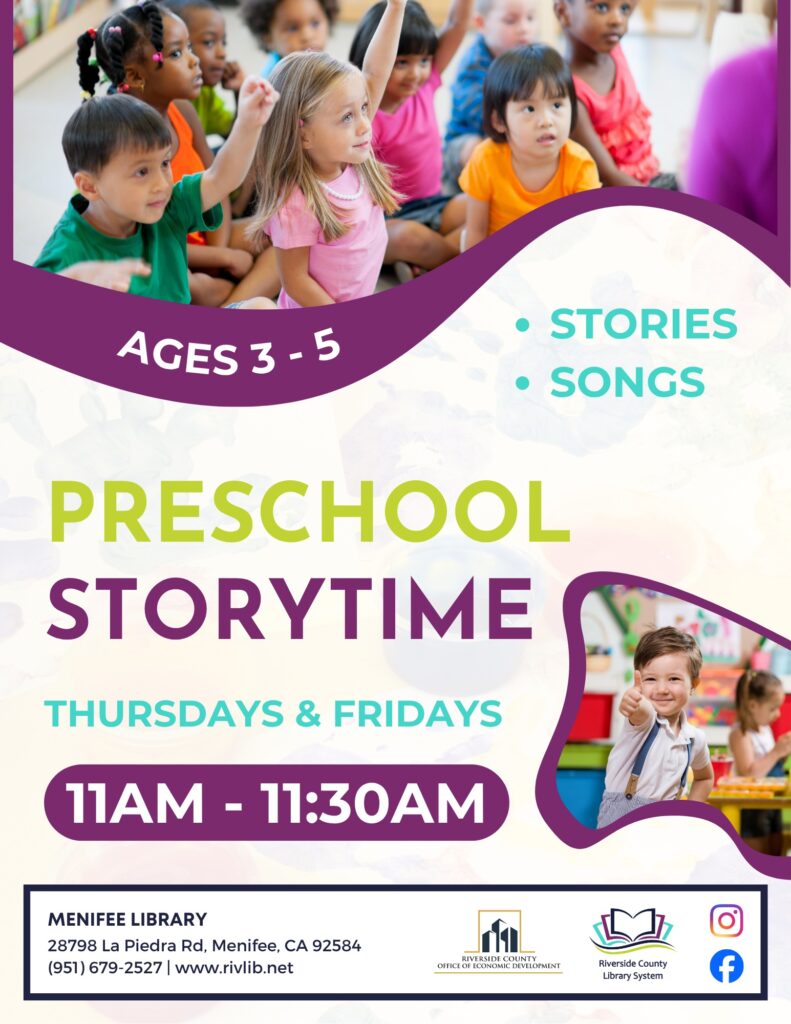Come join Menifee Library from 11am – 11:30am in the Community Room for a Preschool Storytime. The program will be the same both days.