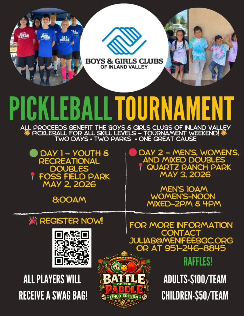 Join us for the Battle of the Paddle: Cinco Edition, a 2-day tournament benefiting youth ages 3–18 in the Menifee & Perris communities through the Boys & Girls Clubs of Inland Valley. Whether you’re a beginner or a seasoned player, there’s a place for you on the court!