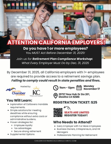 By December 31, 2025, all California employers with 1+ employees are required to provide access to a retirement savings plan. Failing to comply could result in state penalties and fines. FREE WORKSHOP!