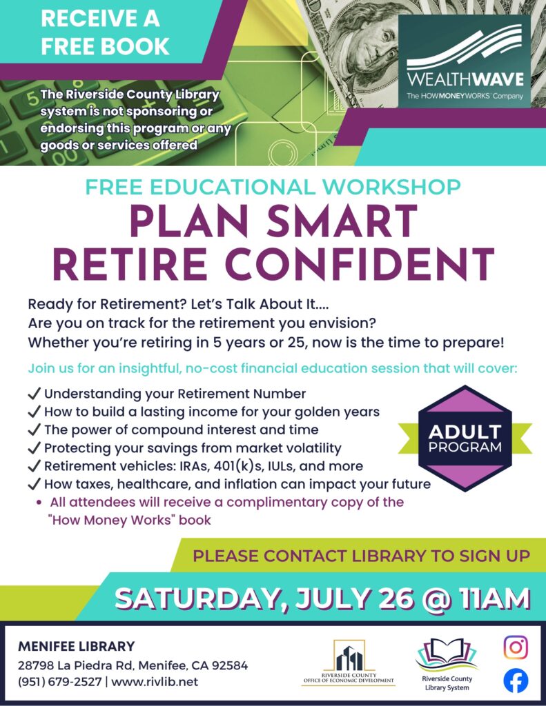 Come join Menifee Library on Saturday, July 26th, from 11am to 12pm for a special Retirement Wealth Workshop! Sign up is required!