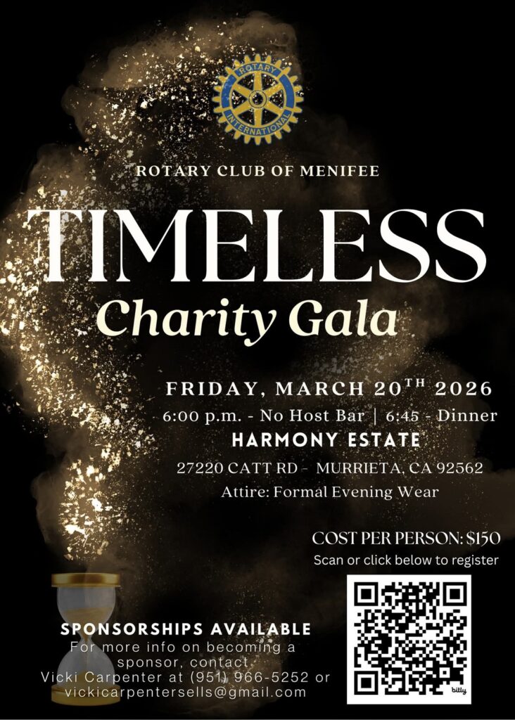Step into an elegant evening of impact at the Timeless Charity Gala hosted by the Rotary Club of Menifee. This formal evening brings together community leaders, business professionals, and changemakers for a night of connection, celebration, and purpose.