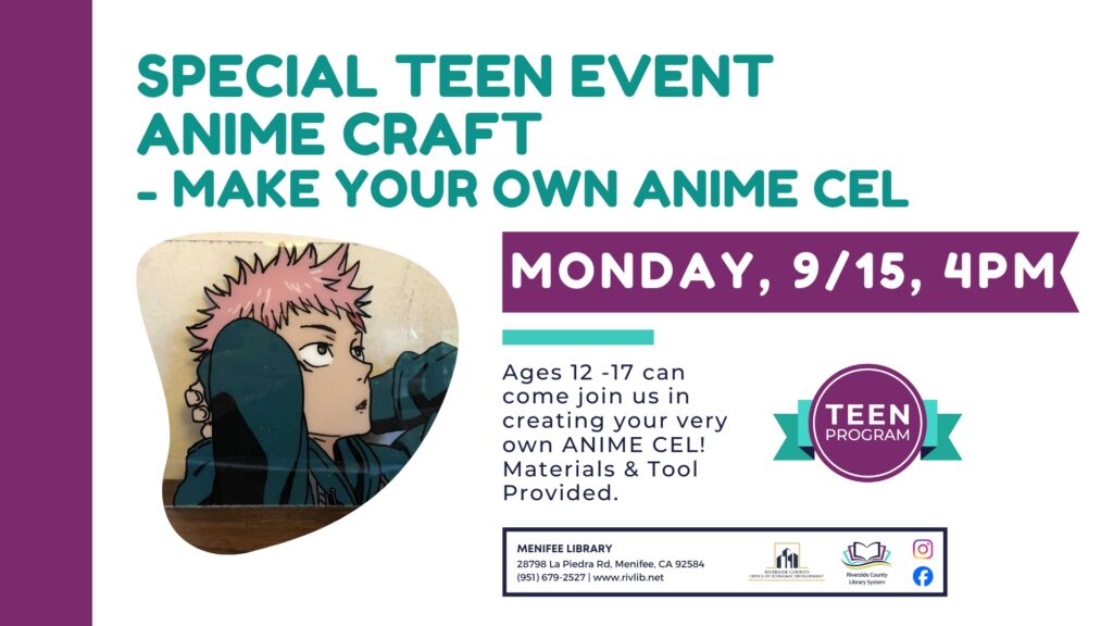 Teens! Come join Menifee Library on Monday, September 15th, at 4pm for a fun teen craft! All tools and supplies will be provided!