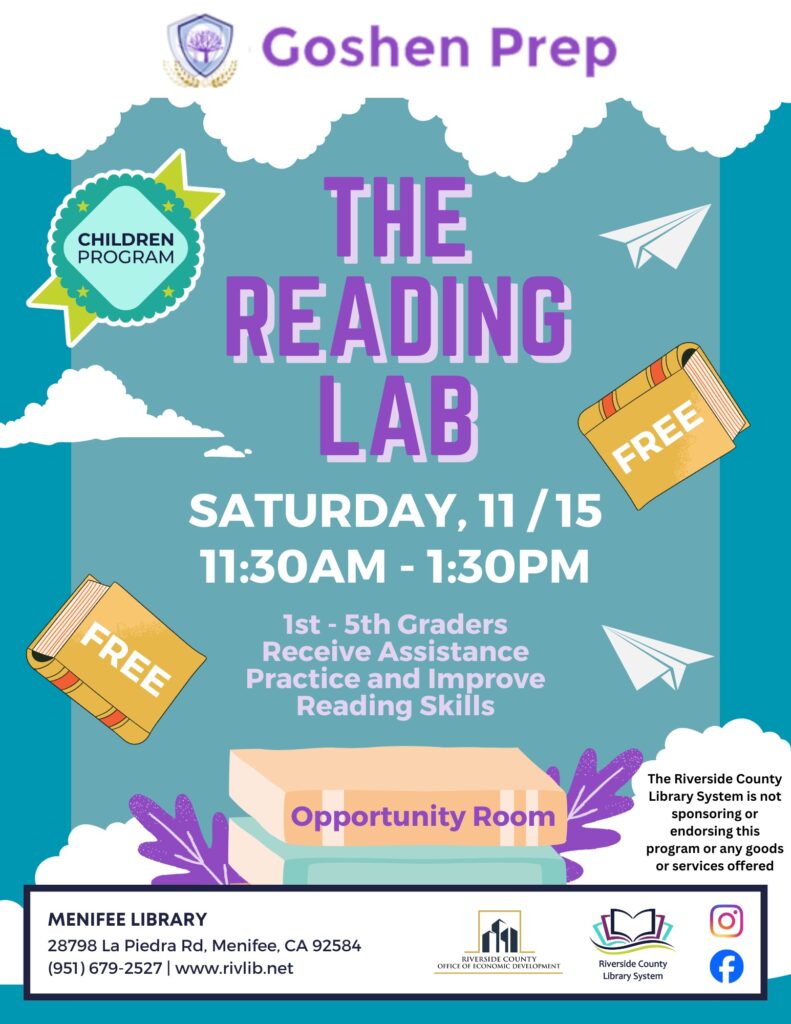 Come join Goshen Prep on November 15th, from 11:30am – 1:30pm, in the Opportunity Room. 1st through 5th graders can come practice and improve their reading skills with assistance.