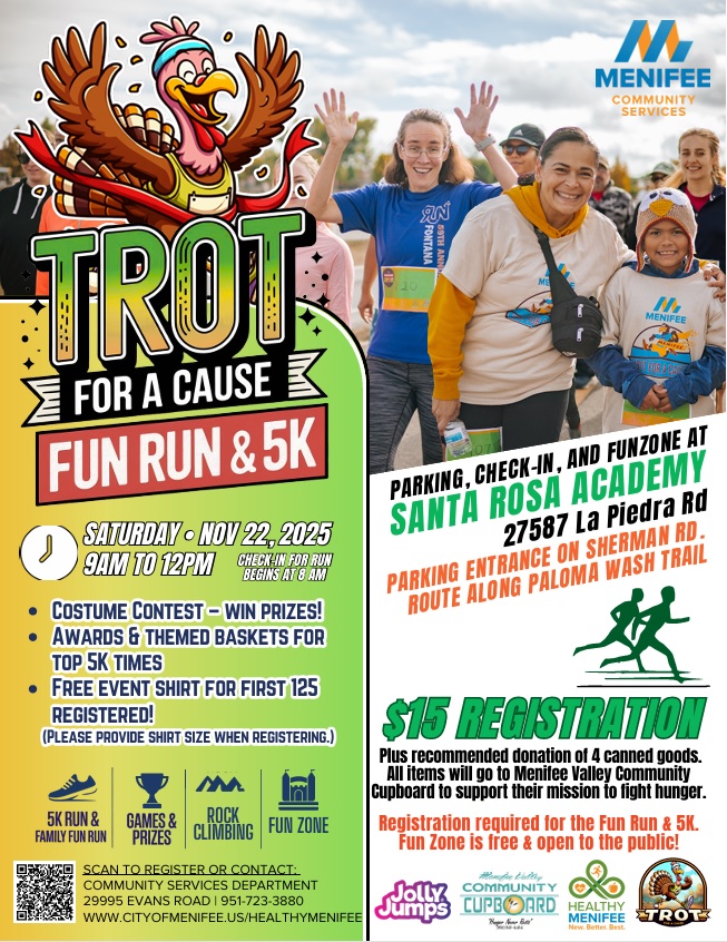 Join Healthy Menifee and the Menifee Valley Community Cupboard in our annual community health run! This event will consist of a non-sanctioned 5k run, family fun-run, and a food drive to help alleviate hunger in Menifee Valley! Registration is $15, and a recommended donation of 4 canned goods per participant.