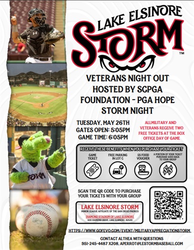 Bring your families and friends & come out for a night of baseball and connection with local Veteran serving orgs and nonprofits on May 26 at Veterans Night Out with the Lake Elsinore Storm hosted by the SCPGA Foundation – PGA HOPE.