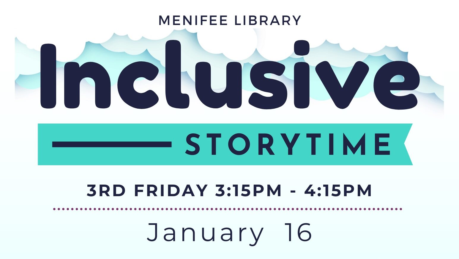 Menifee Library - La Piedra 28798 La Piedra Rd., Menifee, CA, United StatesCome join Menifee Library in the Opportunity Room from 3:15pm - 4:15pm on the first and third Fridays of the month for an Inclusive Storytime. Sensory friendly stories, music and play!