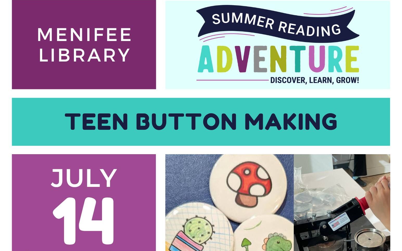 Menifee Library - La Piedra 28798 La Piedra Rd., Menifee, CA, United StatesCome join Menifee Library on Monday, July 14th, at 2pm for a special Teen button making event!