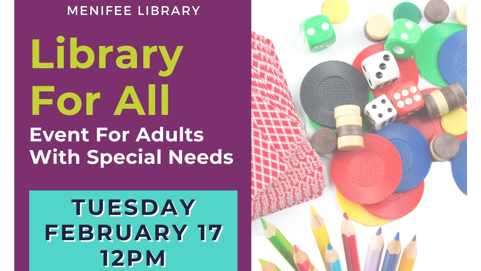 Adults with special needs come join Menifee Library in the Community Room on Tuesday, February 17th, at 12:00pm for a fun afternoon of Board Games and Coloring!